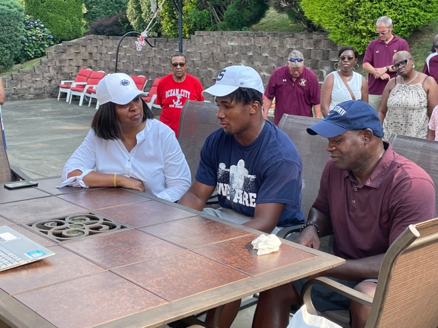 Gov. Mifflin’s Nick Singleton, center, talks about his decision to play at Penn State as his mother, Nichole, left, and father, Tim, listen in July 2021. (MediaNews Group)